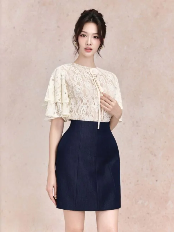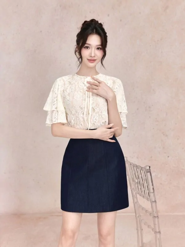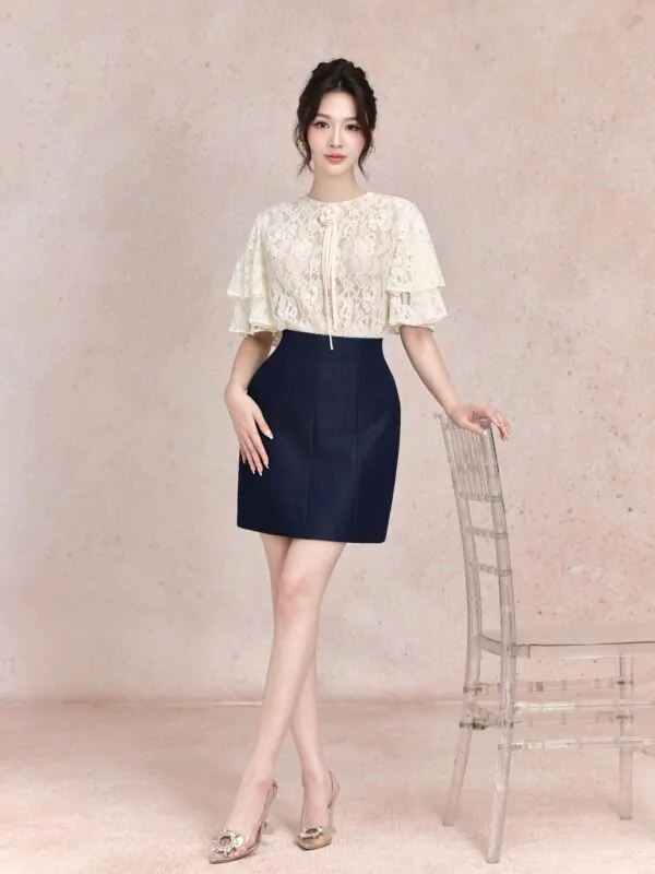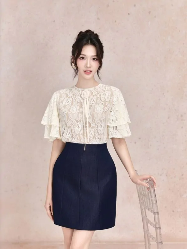 Áo sơ mi lưới chấm bi viền bèo nơ chỉ đen