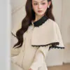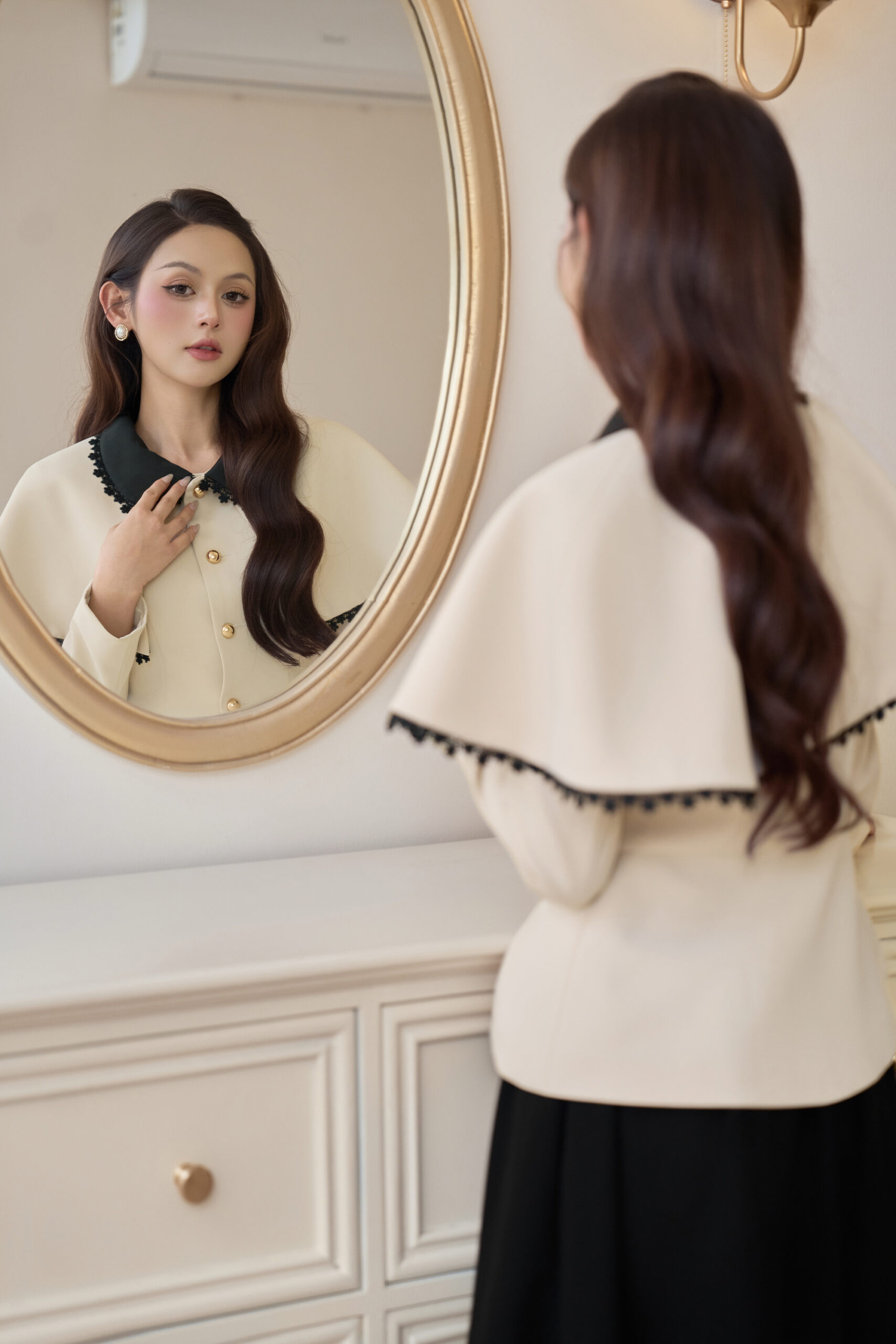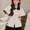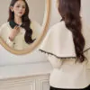 Áo vest chéo dior kem tùng peplum cổ taffa đen không chân viền ren đen tay vest dài phối áo choàng kem